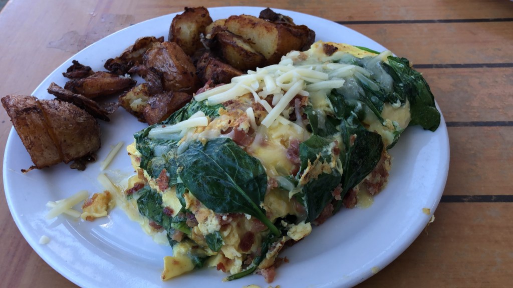 All right, food time. Kihei has a nice selection of breakfast favorites but with flare. I started with the Atkins Omelette. This contains eggs, Portuguese sausage, cheese, ham and bacon. The omelette comes with sliced tomatoes but I subbed those out for fried potatoes. Let me tell you, Kihei Caffe definitely knows how to make an omelette. It was a nice size and almost had me full.. almost.