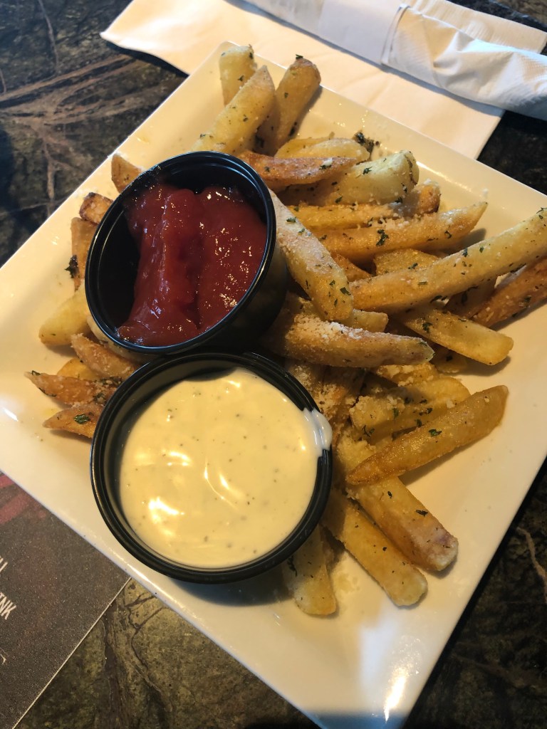 Lastly, I had the garlic fries. These fries were so good and seasoned with the perfect amount of garlic. These come with ranch. I got some ketchup too. Now these were definitely a help in soaking up the champagne.
