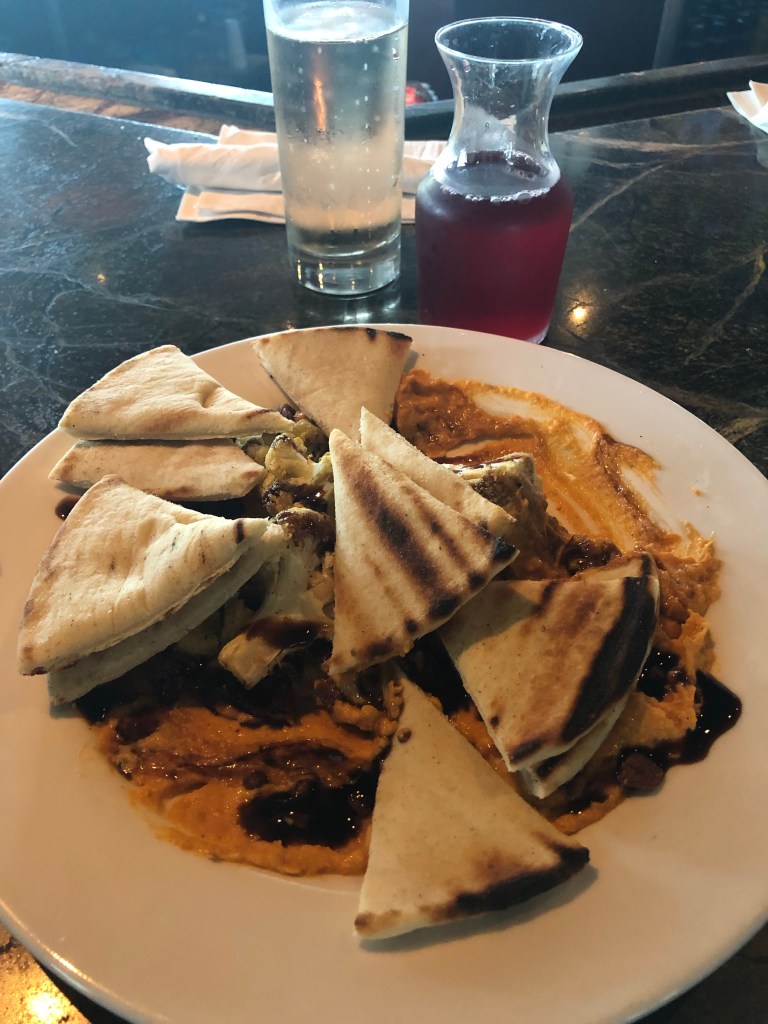 I also tried the Red Pepper Hummus. This housemade hummus is topped with roasted cauliflower, figs, candied pecans and a balsamic glaze. The toppings set the hummus off and the pita chips were very enjoyable.