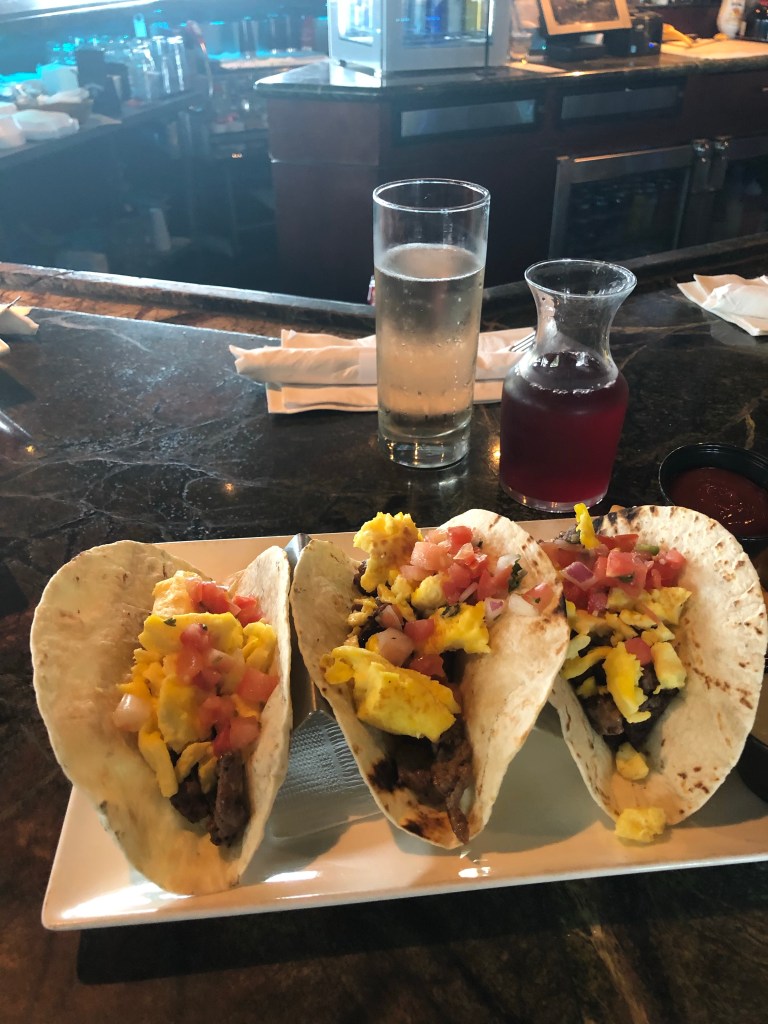 Next on my list was the breakfast tacos. They consist of three tacos filled with ribeye, eggs, pico and queso cheese. You can get grits, potatoes or fruit as a side. The eggs are what set this aside from being a regular steak taco but all the flavor from the ribeye take this to the next level. It’s perfect to soak up some of those bottomless mimosas.